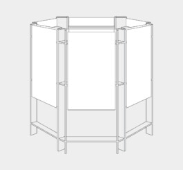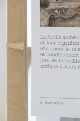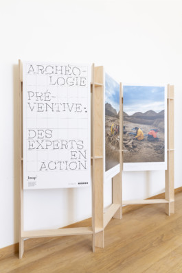 Self-supporting and modular, the Archéokiosque is designed to be deployed indoors. Its basic component is a lightweight picture rail, birch plywood ladder to which a printed support is attached. Based on this simple assembly principle, three configurations are possible: the folding screen, the tripod and the hexagon.