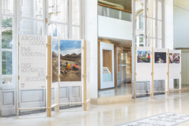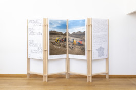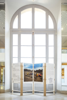 The tripod is an exhibition concentrate, allowing six panels to be displayed on a small surface.